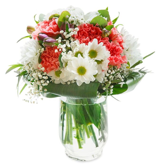 There's a radiant cheerfulness to this floral bouquet, thoughtfully composed by local artisans from Noak Hill and nestled upright in a spotless white gift bag. A tapestry of lush coral and peach carnations forms the heart of the display, their ruffled petals evoking the gentle breezes over Noak Hill's greens and gardens. Sprightly red carnations add a splash of spirited color, while crisp white daisies beam brightly with golden-green centers-tiny suns amid a sea of softness. Wisps of snow-white baby's breath meander through the bouquet, lending a whisper-light delicacy that seems almost weightless. Pausing on the left, just a few closed blooms tinged with purple offer subtle intrigue and promise, a delicate note in the ensemble's harmonious blend. Wide, shiny green leaves ring the bouquet's base, curving protectively and providing both visual depth and a sense of abundance. The white gift bag, invitingly simple with its sturdy ribbon handles, frames the composition and makes it ready for an effortless hand-off or doorstep delivery. Bathed in clear, natural light against a bright white ground, every flower is highlighted in its freshest, most jubilant state. This bouquet captures the spirit of Noak Hill-joyful, welcoming, and sincere-a perfect choice for a birthday surprise, a thoughtful thank you, or simply to bring a touch of the local countryside's bloom into someone's day. This bouquet evokes the spirit of Noak Hill in springtime, its artful composition a celebration of freshness and renewal. At the center, crisp white daisies shine like early morning blooms along Noak Hill's walking paths, surrounded by the plush, coral-pink carnations that offer a playful yet refined burst of color. Delicate streams of baby's breath float among the flowers, their tiny white blossoms catching light and imparting a dreamy softness to the entire arrangement. Accentuating the bouquet, muted alstroemeria buds hint at blooms to come, their subtle pink and purple highlights providing a sophisticated touch amidst the lush foliage. Soft eucalyptus and darker green sprigs provide a cool, inviting framework, grounding the display in the natural beauty familiar to the area's parks and gardens. The clear, uncluttered background draws focus to the harmonious mix of colors and textures, expressing joy, gratitude, and genuine care-perfect for local birthday wishes, seasonal decor, or simply brightening a friend's day in Noak Hill. Crafted with the attentive artistry that defines the area's best florists, this arrangement carries a sense of calm exuberance, making it as fitting for a bedside table as for the heart of a family celebration. Sunlit joy radiates from this vibrant bouquet, a favourite among Noak Hill locals for its effortless blend of energy and grace. At its core, coral-pink carnations ripple with lively ruffles, their fullness inviting the touch, while clusters of immaculate white daisies and soft-petaled chrysanthemums add a whisper of innocence and nostalgia, much like wildflowers seen in neighborhood parks. Sprays of baby's breath lend a gossamer softness, threading through the larger flowers as if weaving morning mist alongside them. On one side, deep magenta alstroemeria buds offer a hint of drama and quiet anticipation, drawing the eye to the promise of new blooms. Verdant leaves-both broad and slender, some glossy, others more muted-frame the ensemble in harmonious green, echoing the treetops of local green spaces. The clear glass vase, filled with pure water, showcases the sturdy stems and underscores the arrangement's fresh-from-the-florist character. With every petal and leaf illuminated by steady, gentle lighting, this bouquet is the perfect gift to celebrate life's bright moments-from anniversaries and milestone birthdays to simple acts of gratitude-all thoughtfully crafted for Noak Hill's vibrant community.